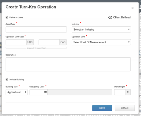On the Create TK Operation window, fill in the input fields. The fields marked with an asterisk (*) are required. All turn-key operations created by clients are marked as Client Defined.
