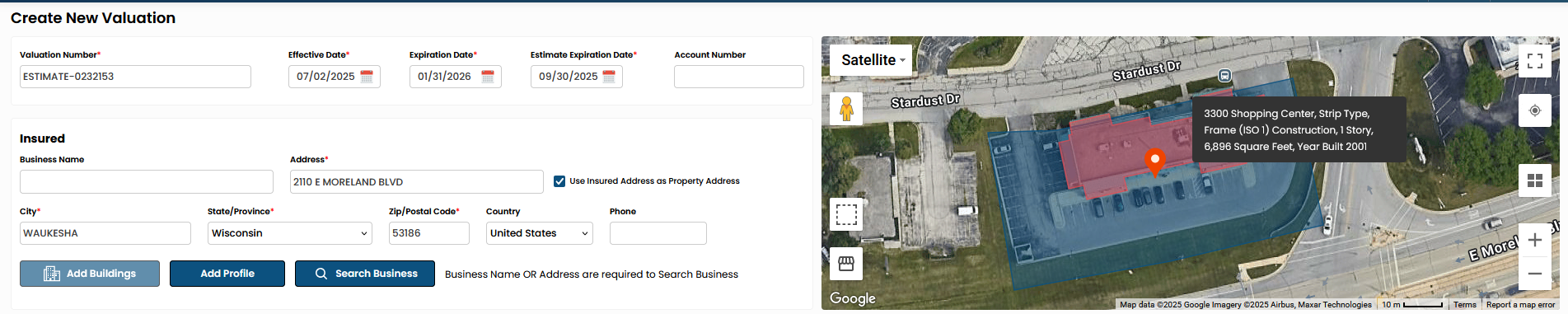 On the Create Valuation page, clients that license Building Prefill a map has been added to display the parcel boundary and the building polygons for those buildings where polygon data exists. This data coincides with building prefill. If there is no building prefill available for an address, then the map will not display any boundaries, but will show a point on the map to match the address.